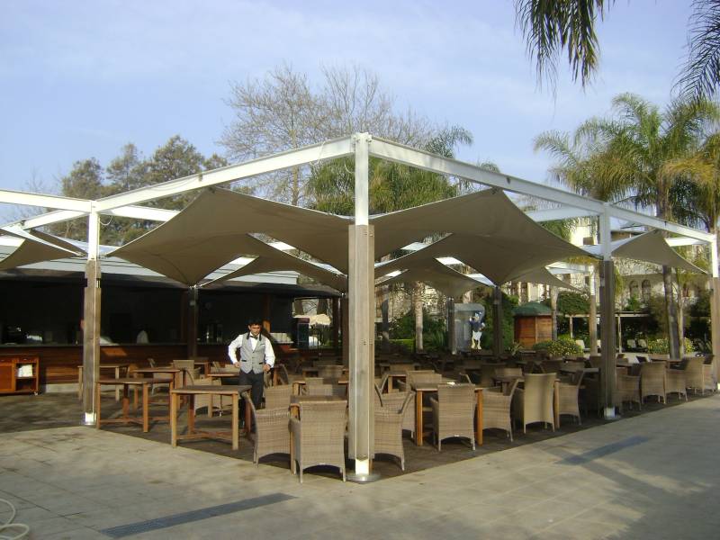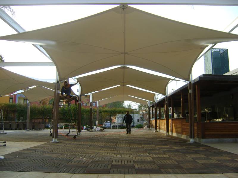 Side Star Elegance Asma germe yapı sistemi – Antalya Asma germe gölgelik sistemi 7 adet hiper formdan oluşmakta. Membran yüzeyler kare şeklindeki mevcut çelik konstrüksiyona 8 noktadan bağlandı. Bağlantı sayısının artması sayesinde sistemin sağladığı gölge miktarı arttı. Yer: Side / Antalya Geriye dön