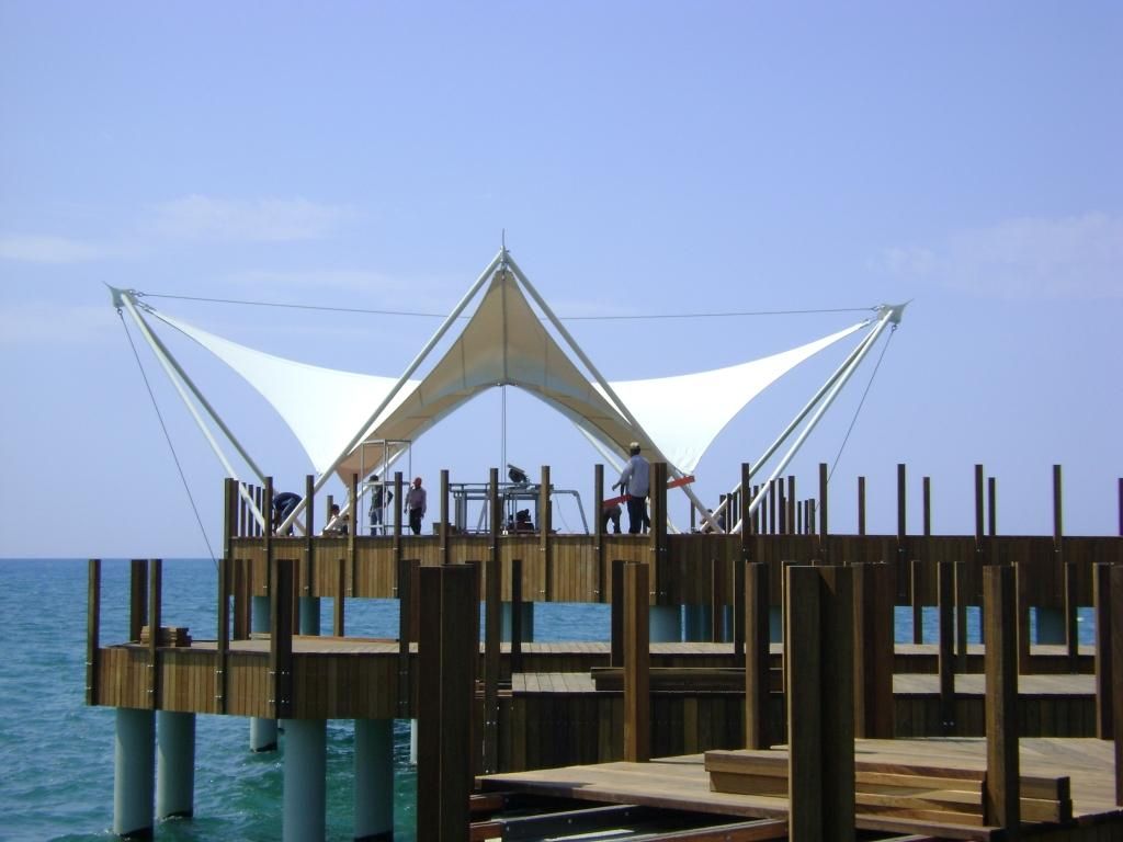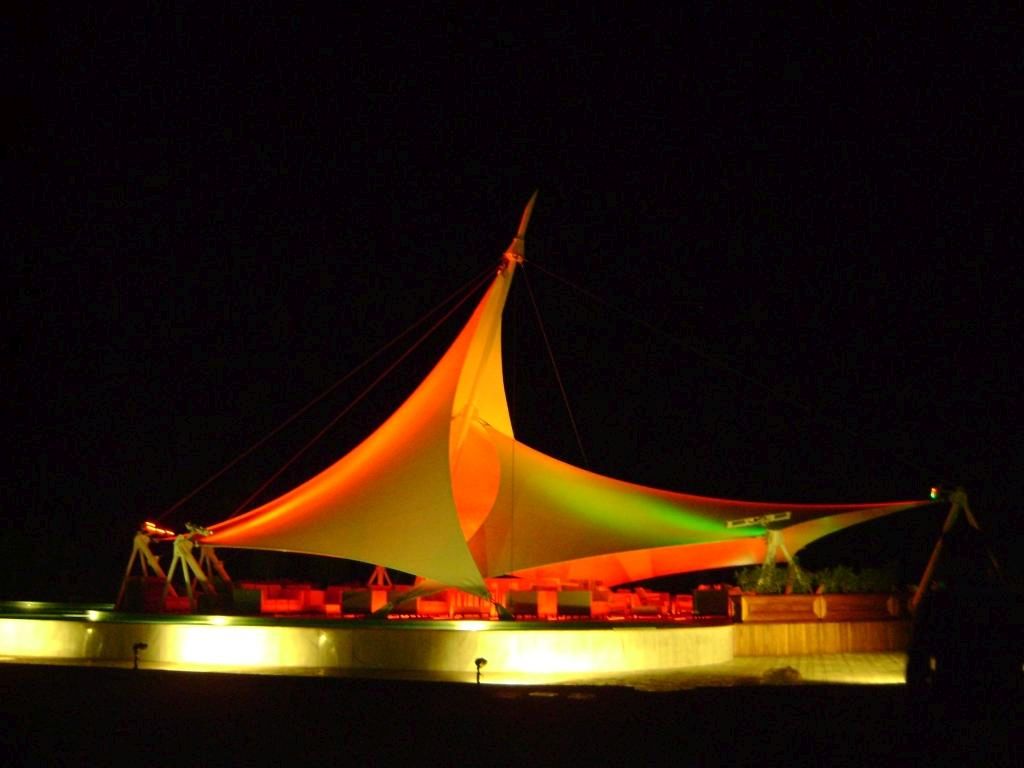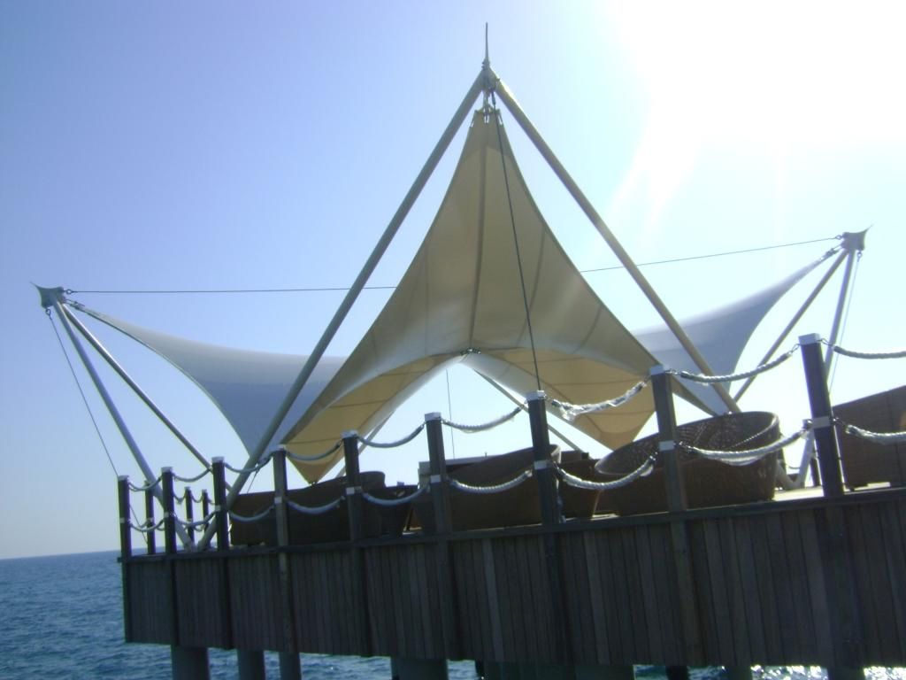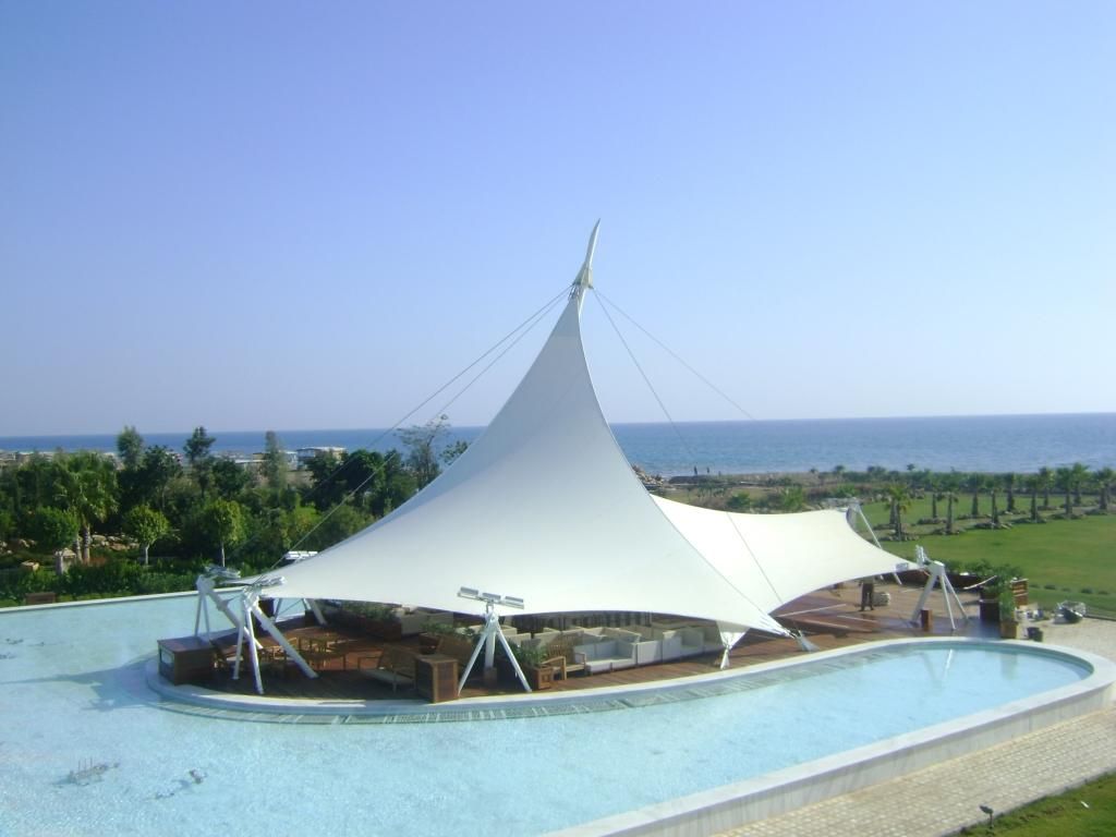 Proje kapsamında birden fazla asma germe sistem tasarımı ve uygulaması gerçekleştirdik. Restorant projesi iki adet iç içe geçen asma germe hiper formdan oluşmaktadır. Büyük olan parça süs havuzu motor dairesi üzerine kuruldu. Genel olarak sistemin geometrisi belirlenirken betonarme yapının kolon kiriş yapısı belirleyici oldu. İşverenin önerisiyle, görsel etkiyi artırmak amacıyla membran orta mesnet noktaları mümkün olduğunca düşük kotta tutuldu. Belli oranda işlevsellik kaybı yaşansada hedeflenen görsel etki sağlandı.