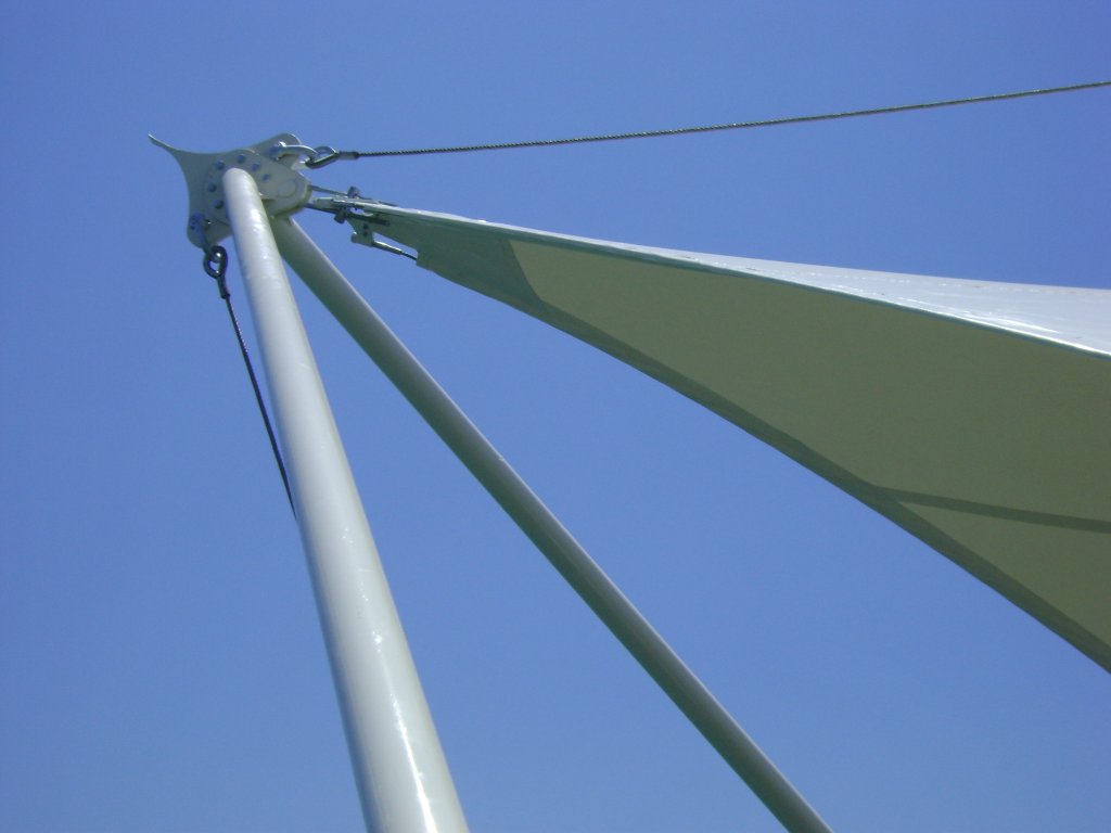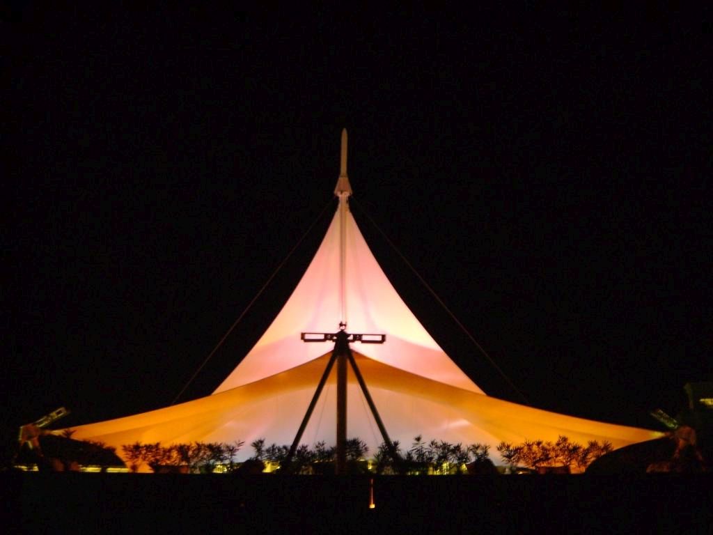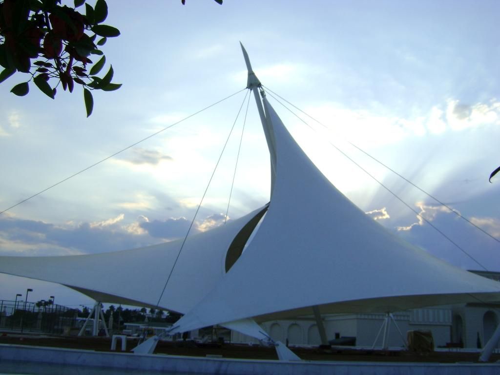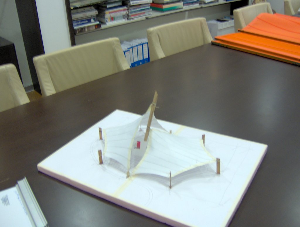 Proje kapsamında birden fazla asma germe sistem tasarımı ve uygulaması gerçekleştirdik. Restorant projesi iki adet iç içe geçen asma germe hiper formdan oluşmaktadır. Büyük olan parça süs havuzu motor dairesi üzerine kuruldu. Genel olarak sistemin geometrisi belirlenirken betonarme yapının kolon kiriş yapısı belirleyici oldu. İşverenin önerisiyle, görsel etkiyi artırmak amacıyla membran orta mesnet noktaları mümkün olduğunca düşük kotta tutuldu. Belli oranda işlevsellik kaybı yaşansada hedeflenen görsel etki sağlandı.