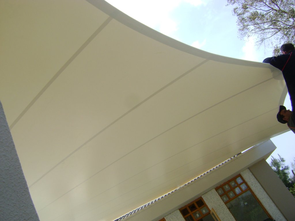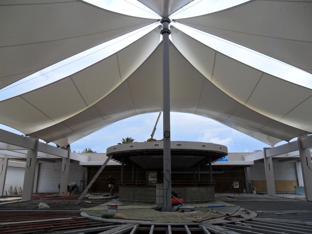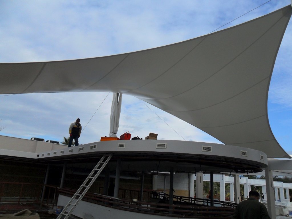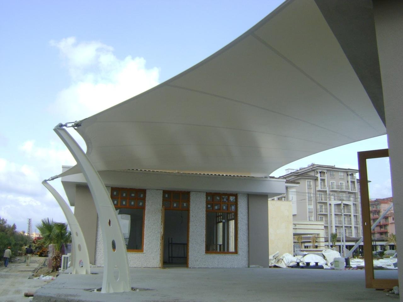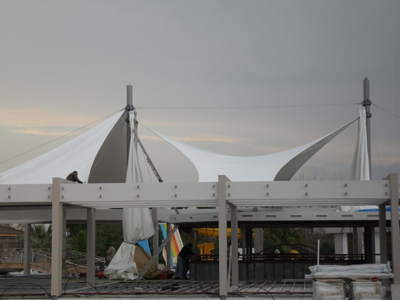 Proje kapsamında iki farklı asma germe membran yapı uygulaması yaptık. Her iki projede hiper formdadır. Çocuk oyun odalarının arasında bulunan açık alan betonarme yapılardan yararlanılarak kapatıldı. İkinci projemiz olan restorant ise parçalı bir yapı olup asma germe hiper formlardan oluşmakta. Parçalı yapıyla doğal hava dolaşımının yüksek düzeyde olması sağlandı. Alanın, membran parçalar arasında oluşan boşluklardan yağmur almasını engellemek için ikinci bir katman olarak sisteme üçgen düz membran parçalar eklendi.