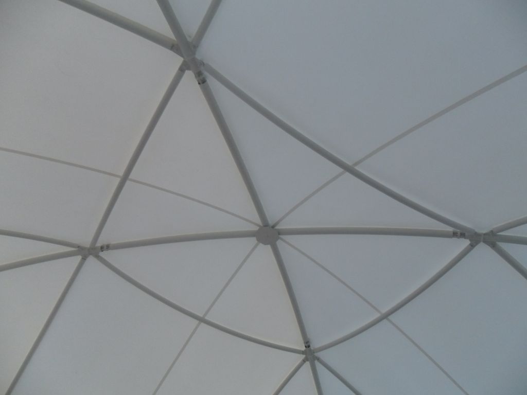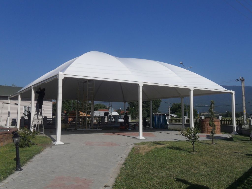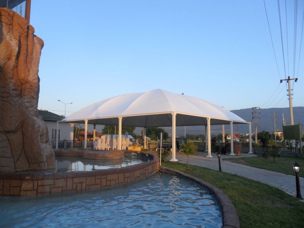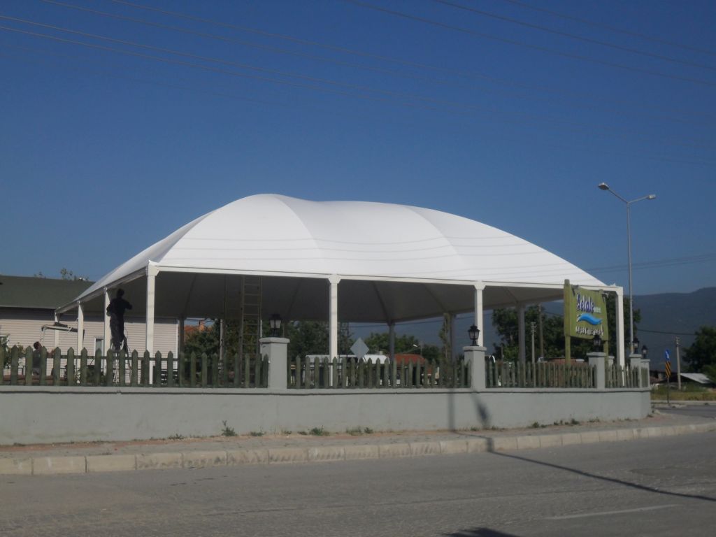 Tasarım imalat ve montajını yaptığmız asma germe sistem kemer formdan oluşmaktadır. Projenin kenarları dere görevi gören bir kirişle çevrilidir. Yağmur suları bu dere içinden tahliye edilmektedir. Yapı sisteminin ortasında direk bulunmamaktadır. Bu özellik yapıya yüksek düzeyde kullanılabilirlik sağlamaktadır. Yapı toplantı tören alanı olarak kullanılmaktadır. Bolu Şelale Parkta bulunan asma germe membran projemiz kabaca 200m2 dir. Taşıyıcı sistemin tüm detayları portatif olarak çözüldü. Yapı sisteminin geometrisi bahçeden hareketle belirlendi.